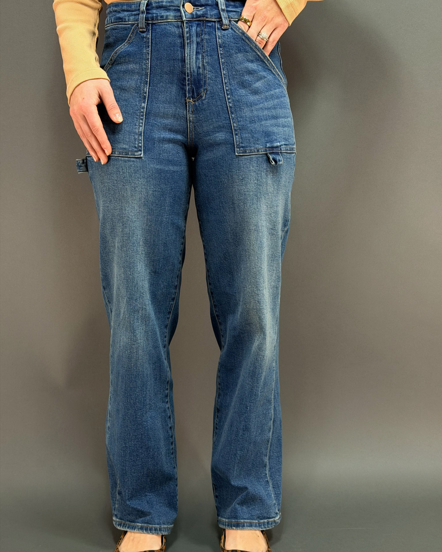 woman wearing wide leg painter style jeans in front of a gray background